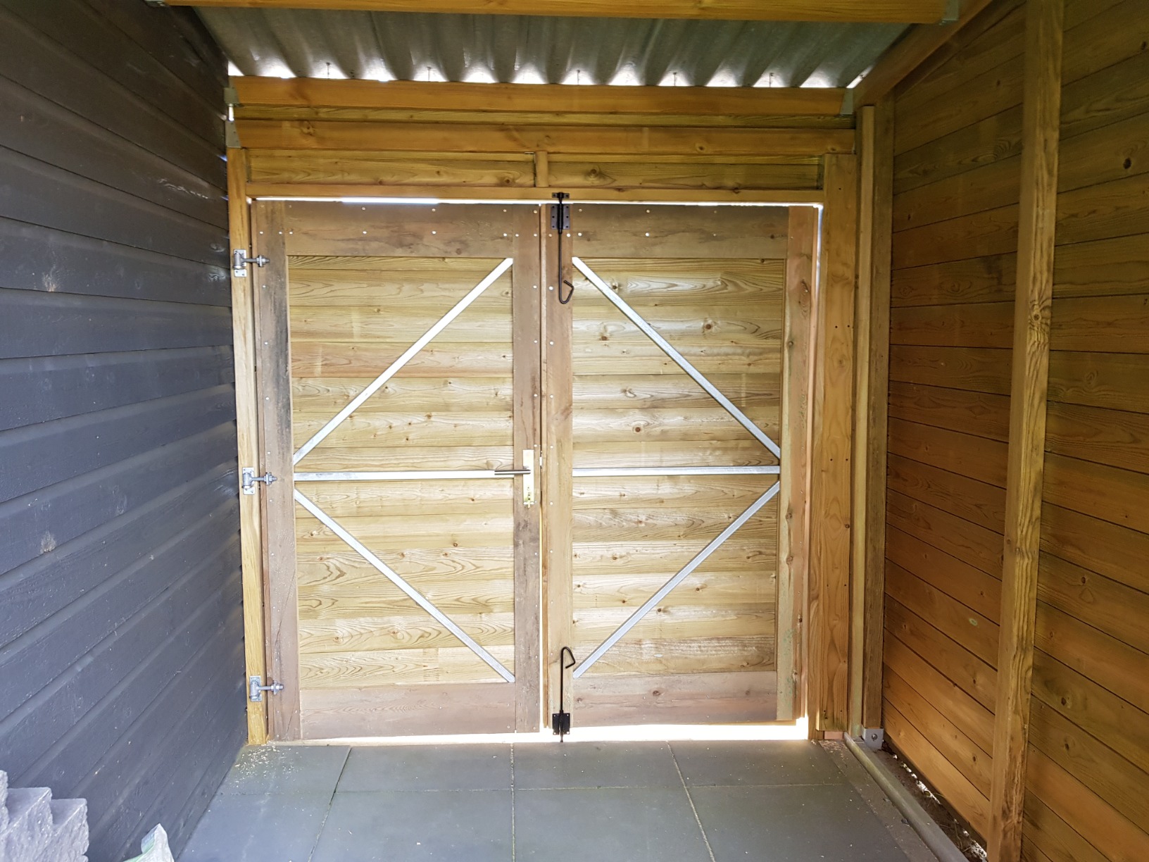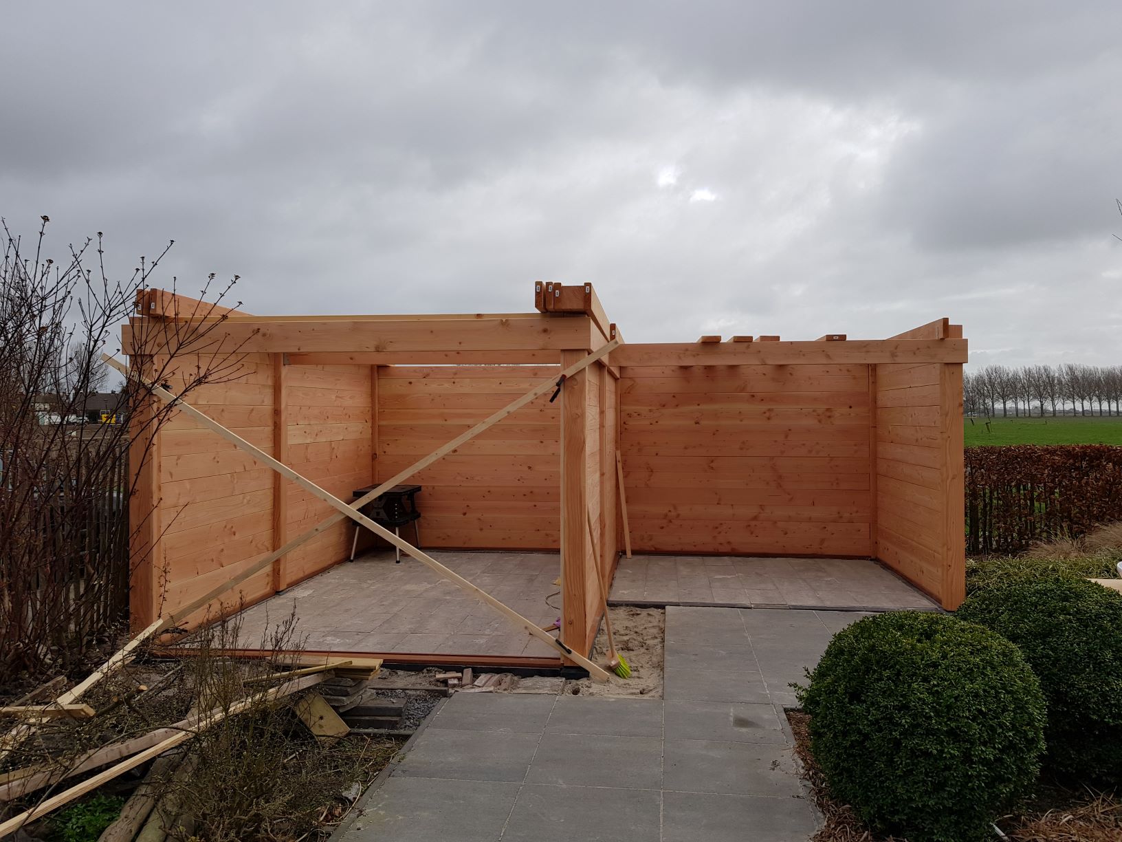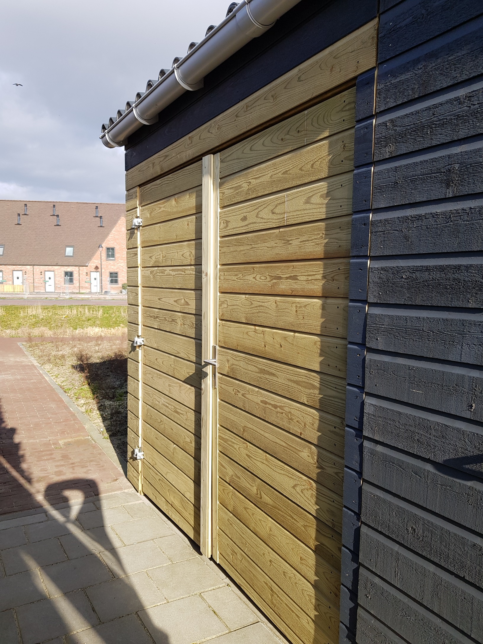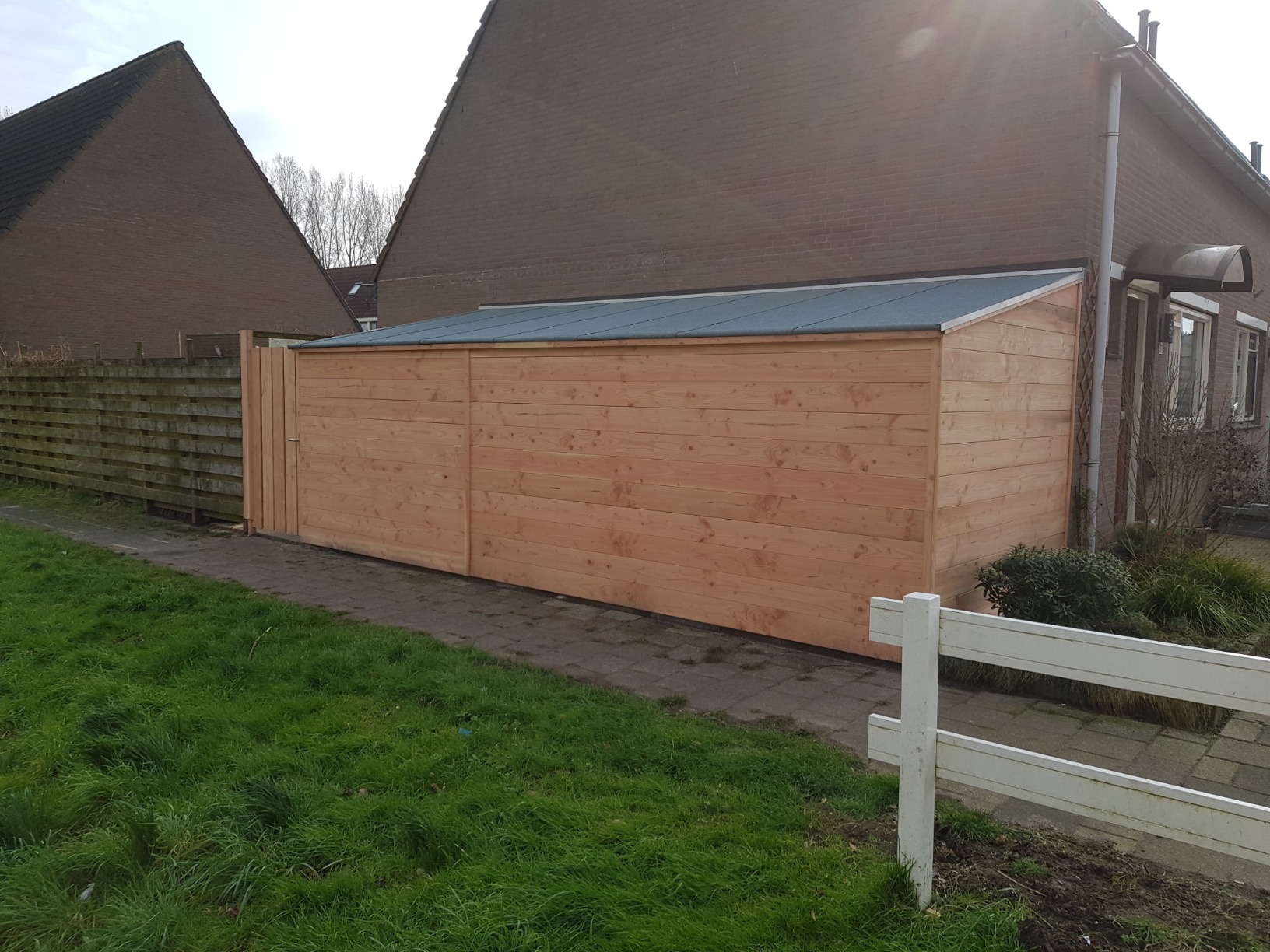 • Douglas blokhut profiel (6,5 x 2,5 meter) met 1 meter brede schuurdeur. Dak voorzien van zelfklevende bitumen met grijze lei.