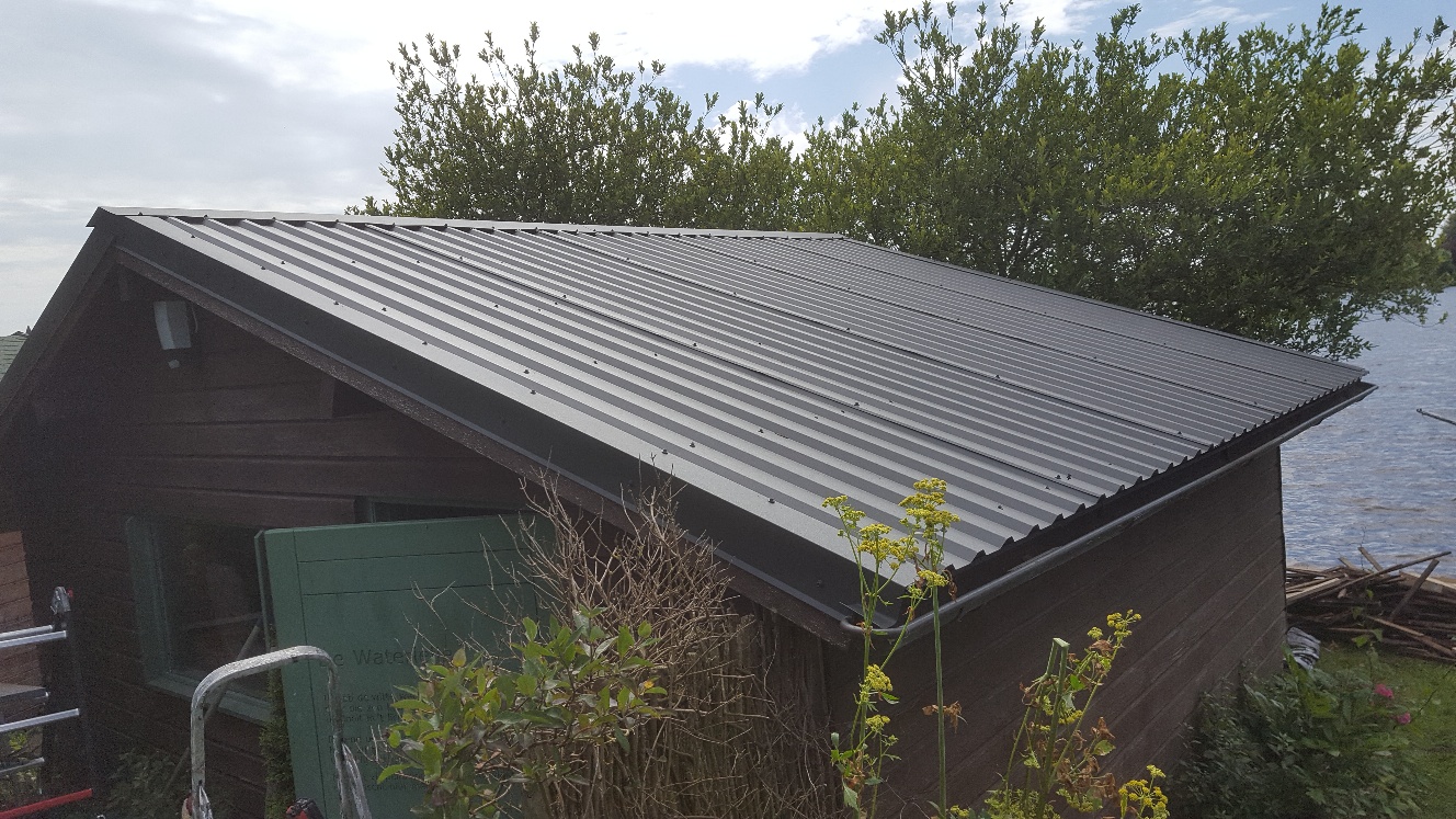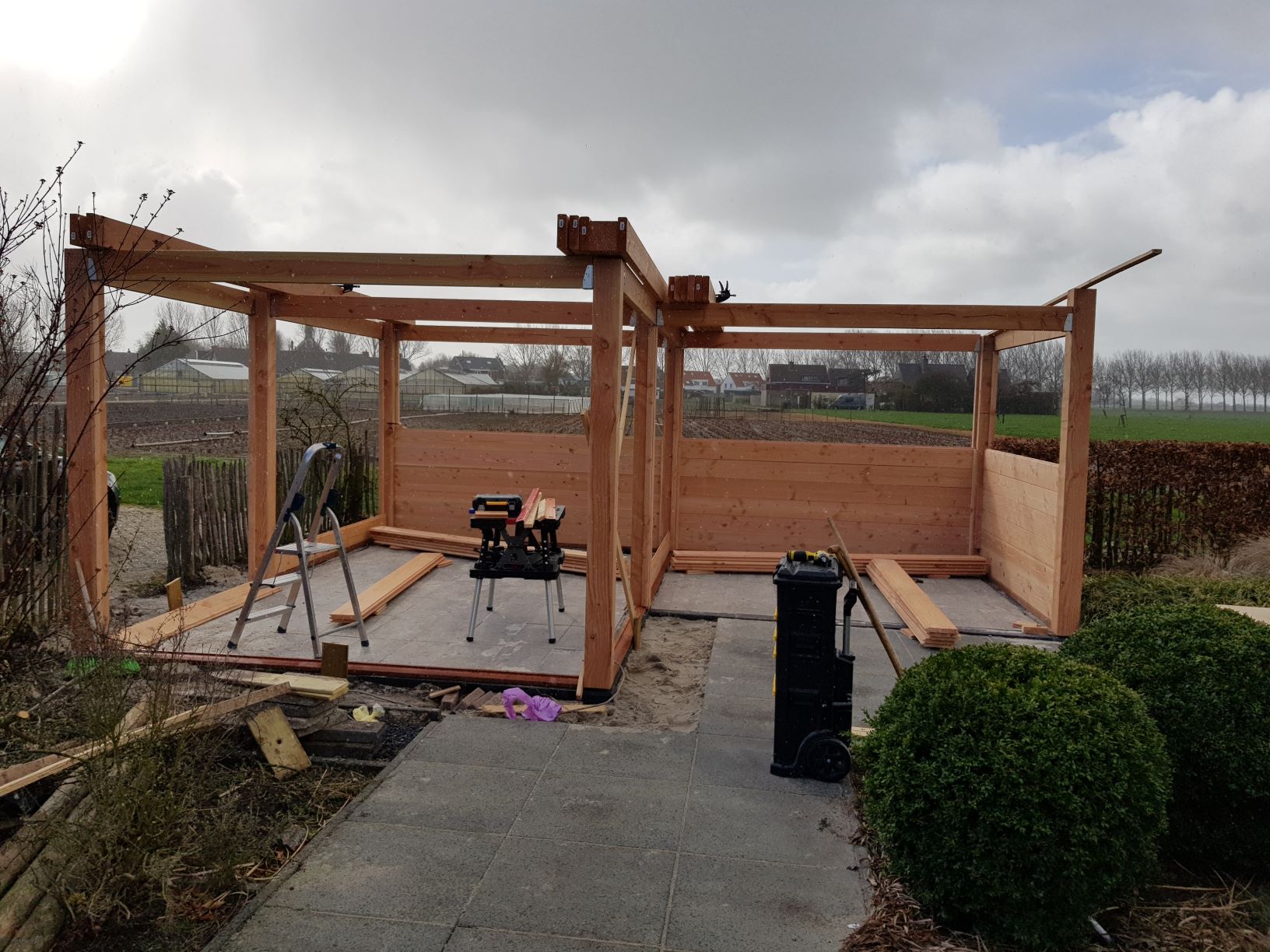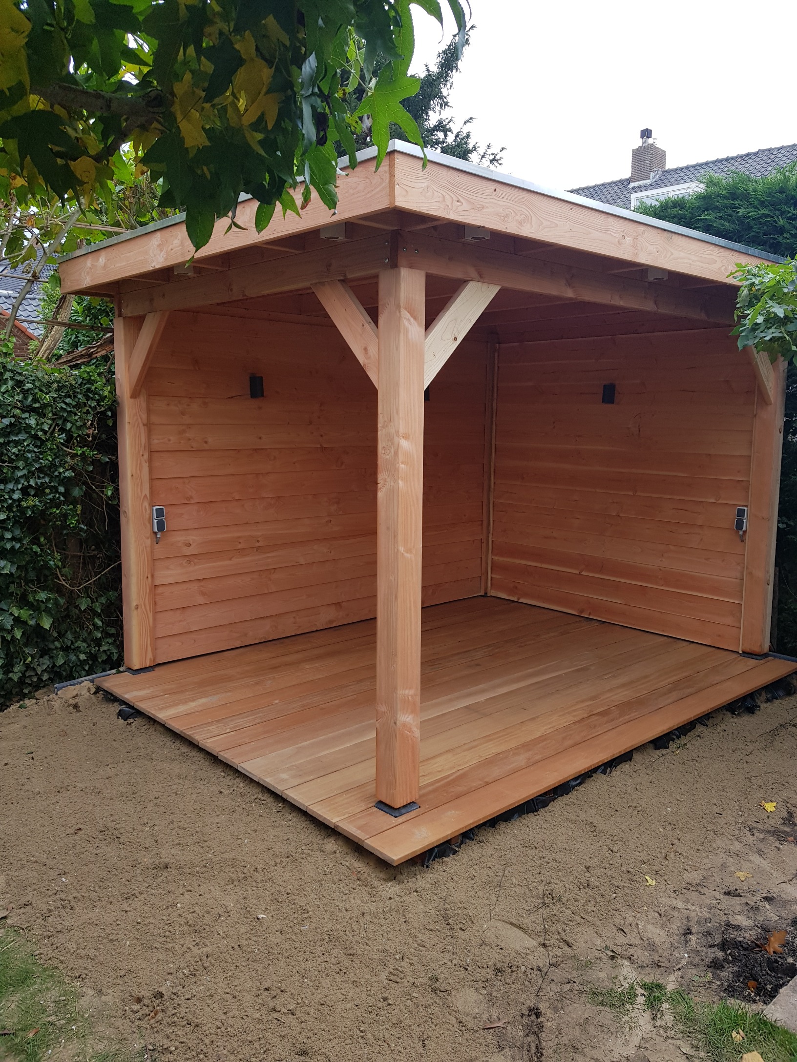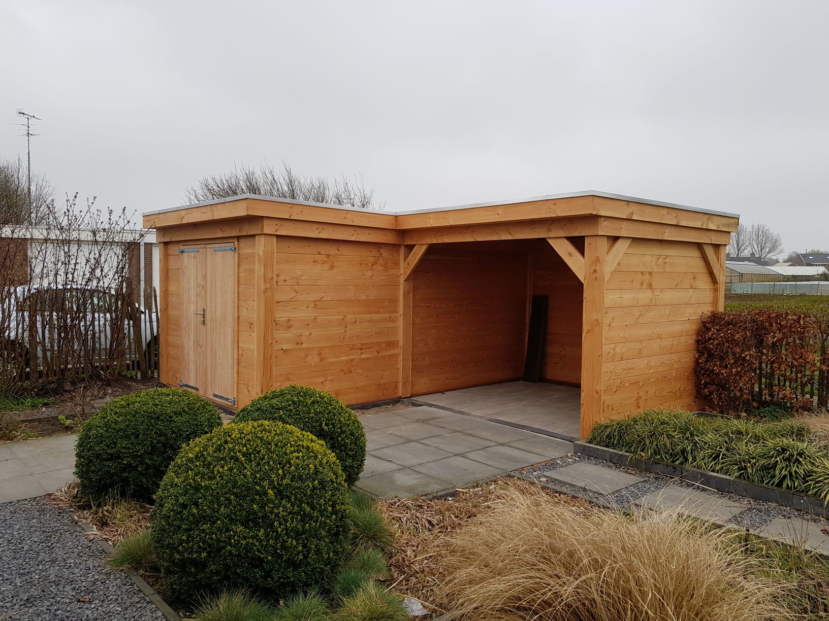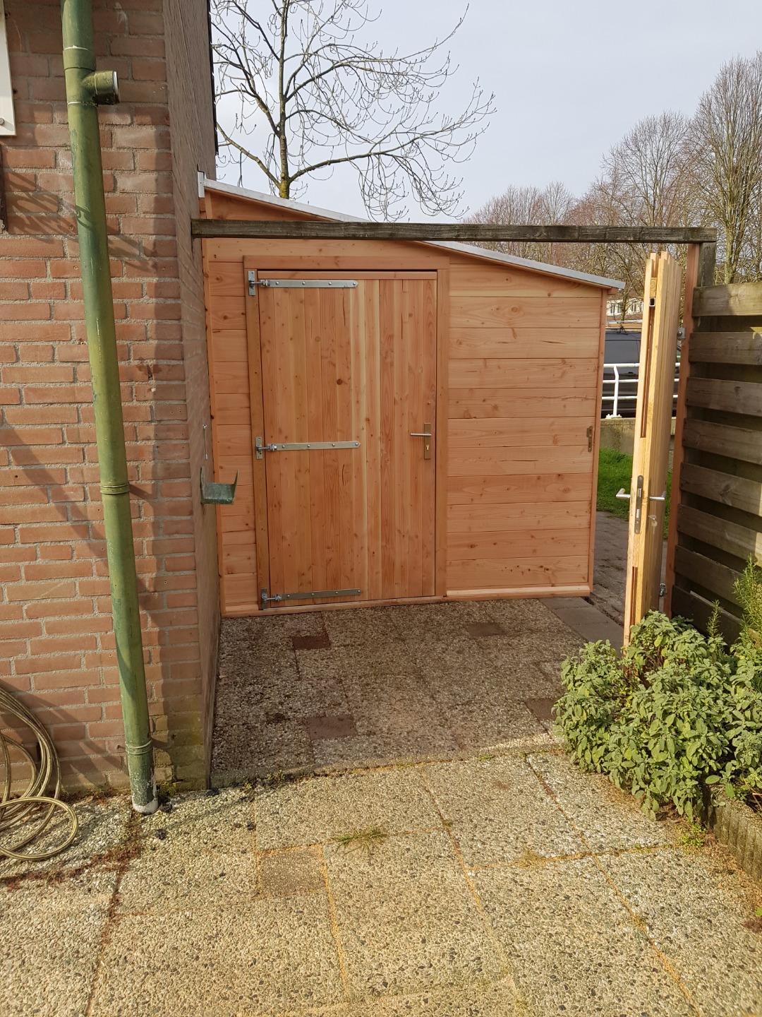 • Douglas blokhut profiel (6,5 x 2,5 meter) met 1 meter brede schuurdeur. Dak voorzien van zelfklevende bitumen met grijze lei.