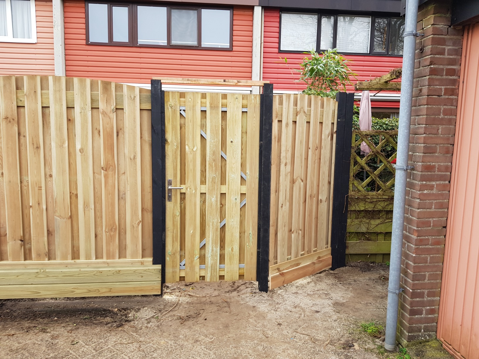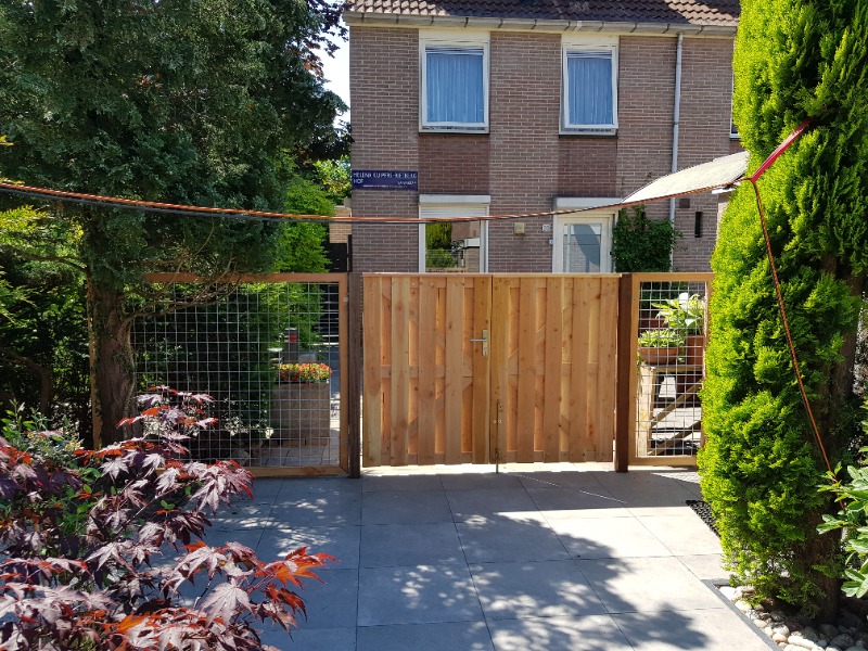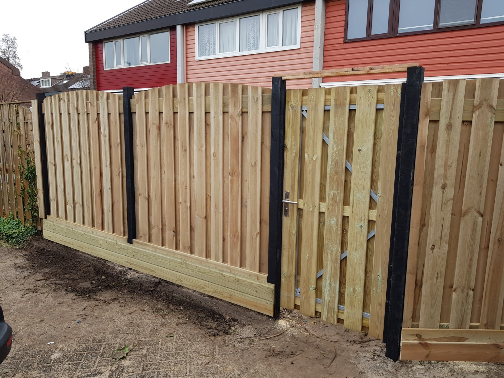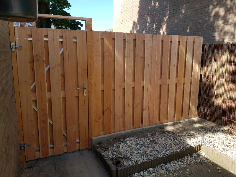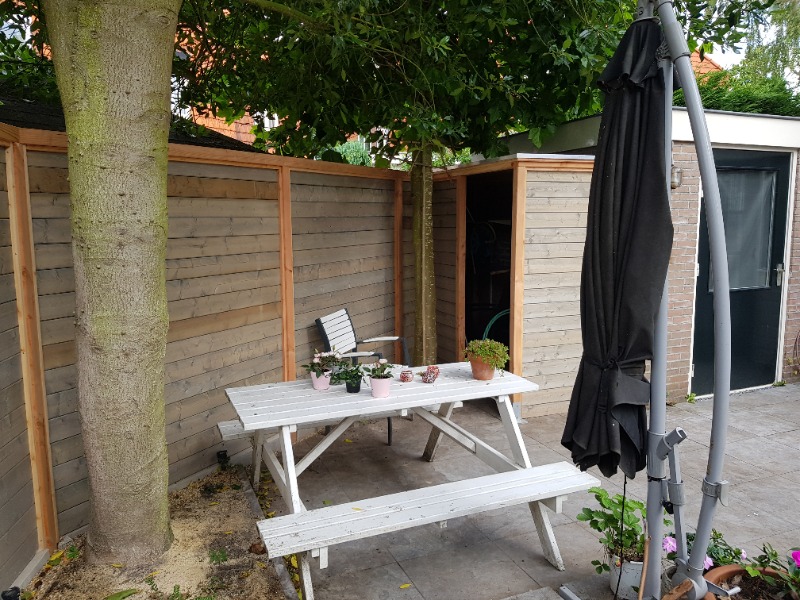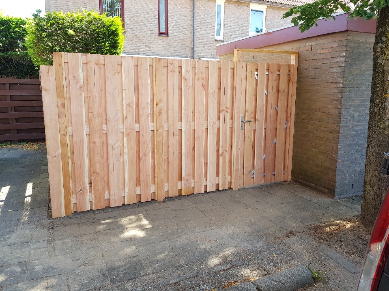 • Schuttingdeel gemaakt van 1,6 cm dikke Douglas schutting planken en Douglas palen 8,5×8,5 cm.