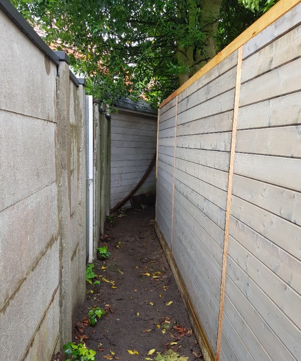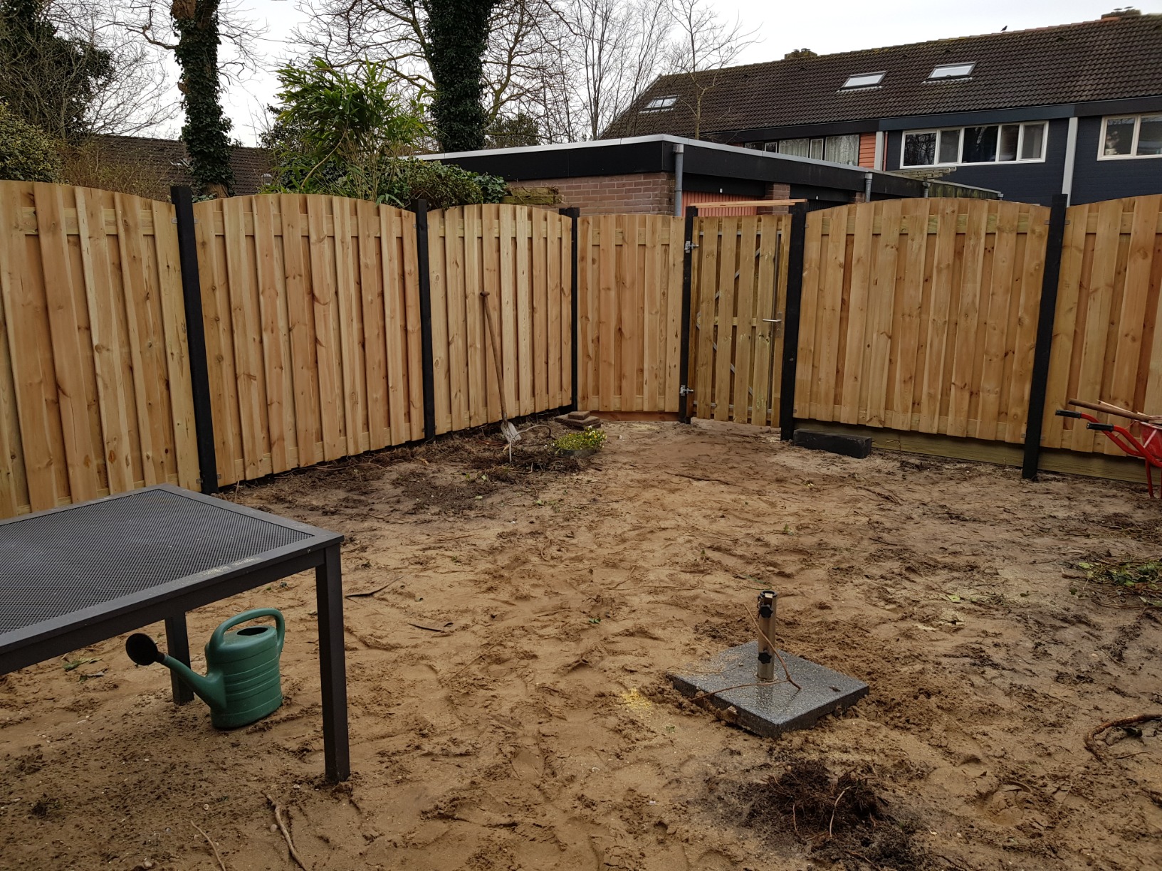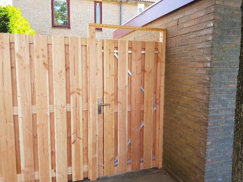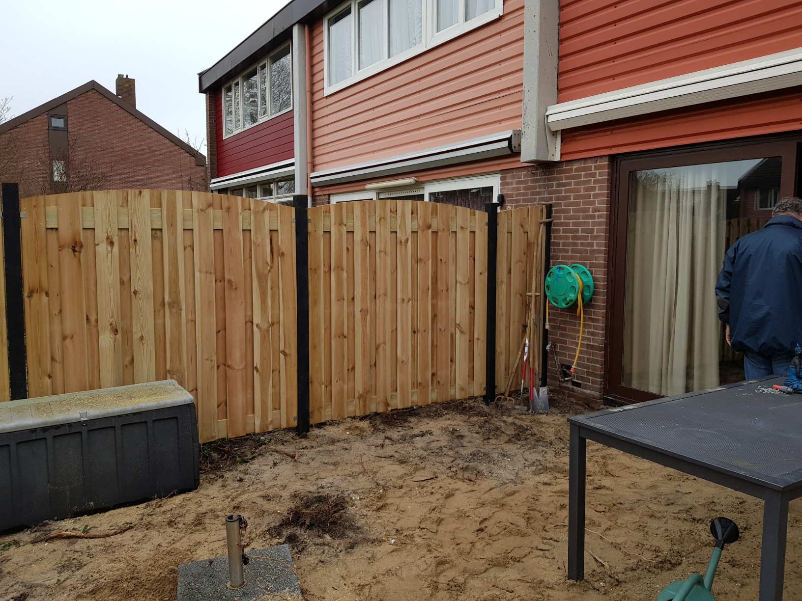 • Schuttingdeel gemaakt van 1,6 cm dikke Douglas schutting planken en Douglas palen 8,5×8,5 cm.