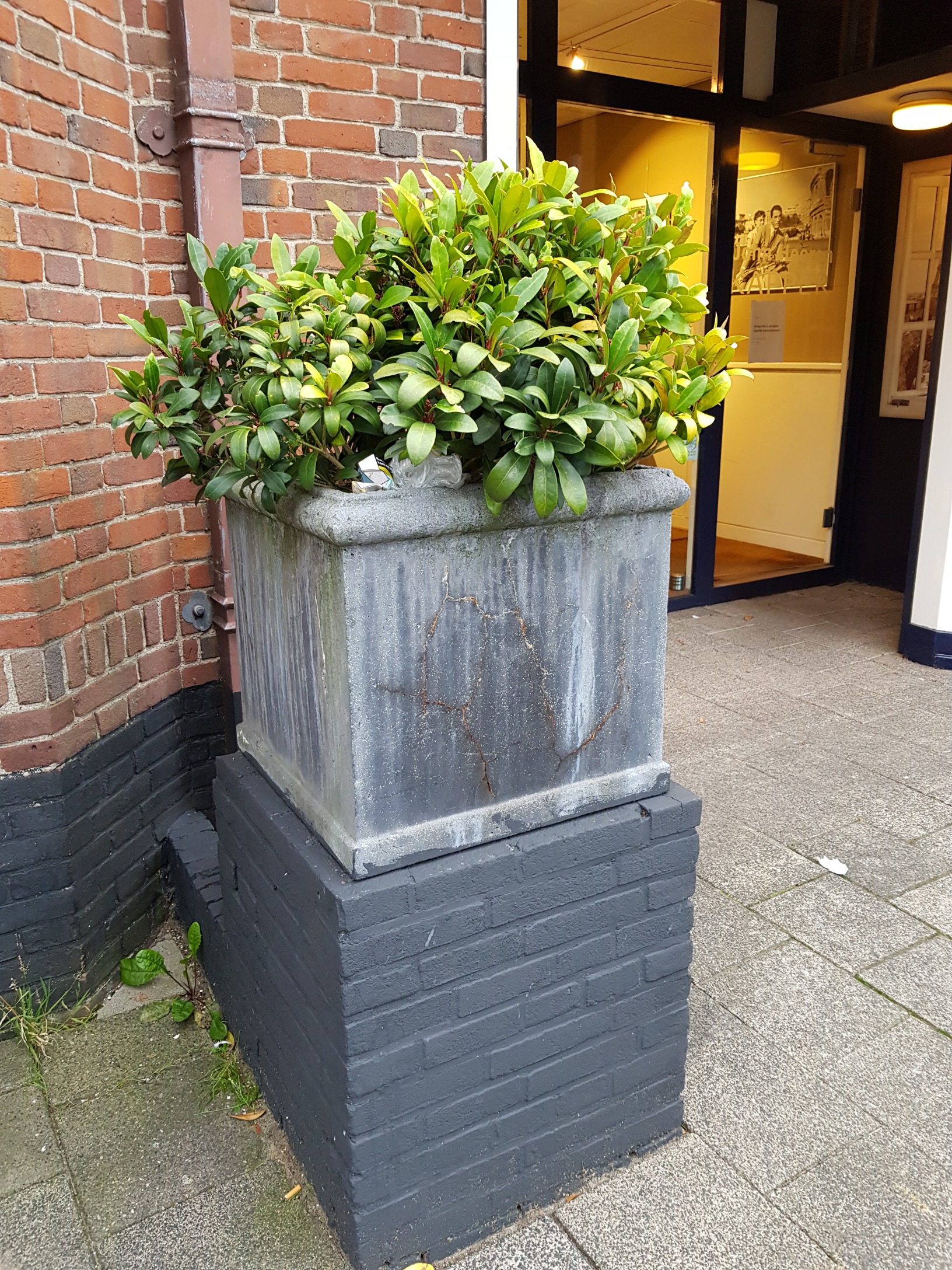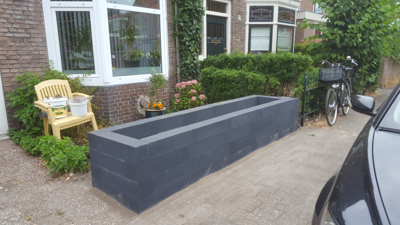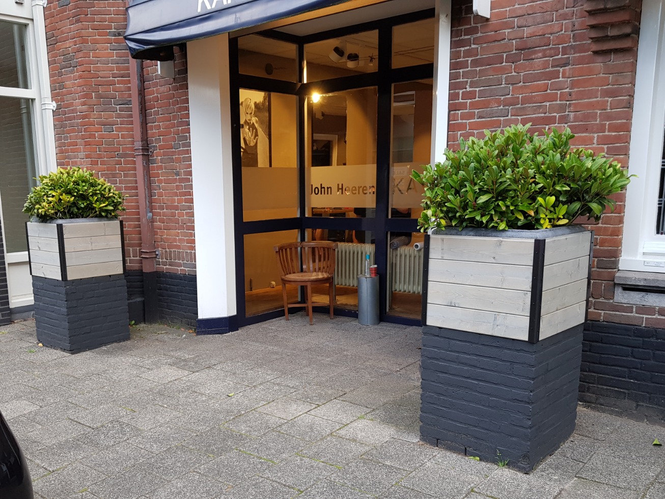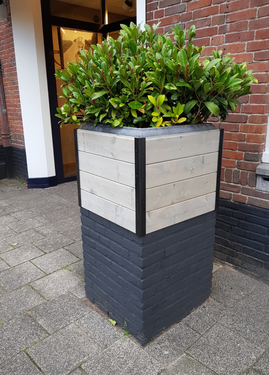 • Poreuze bloembakken voorzien van houten grijze zijwanden (blokhutprofiel 28 mm dik) en gewalste ijzeren hoeklijn.