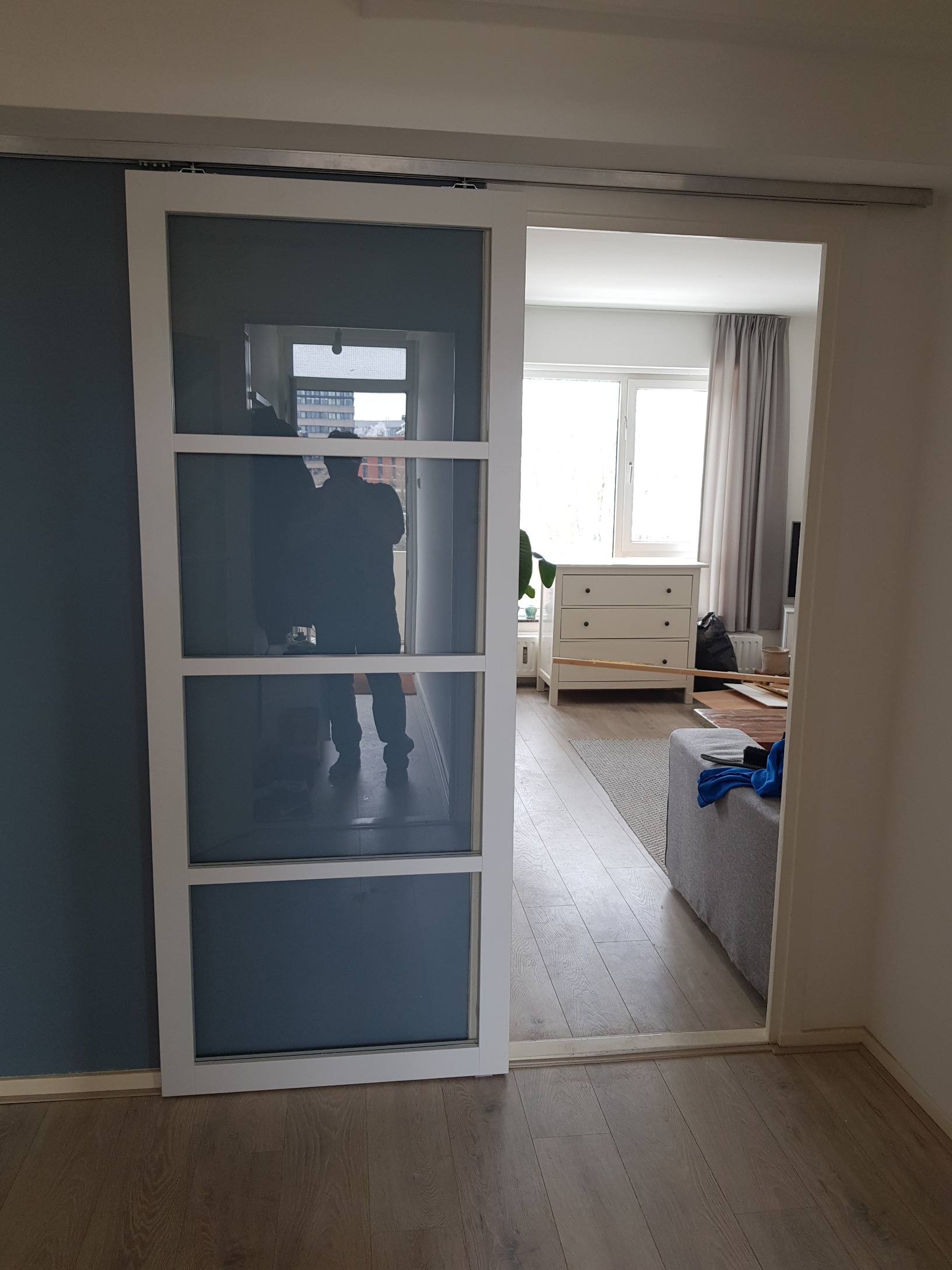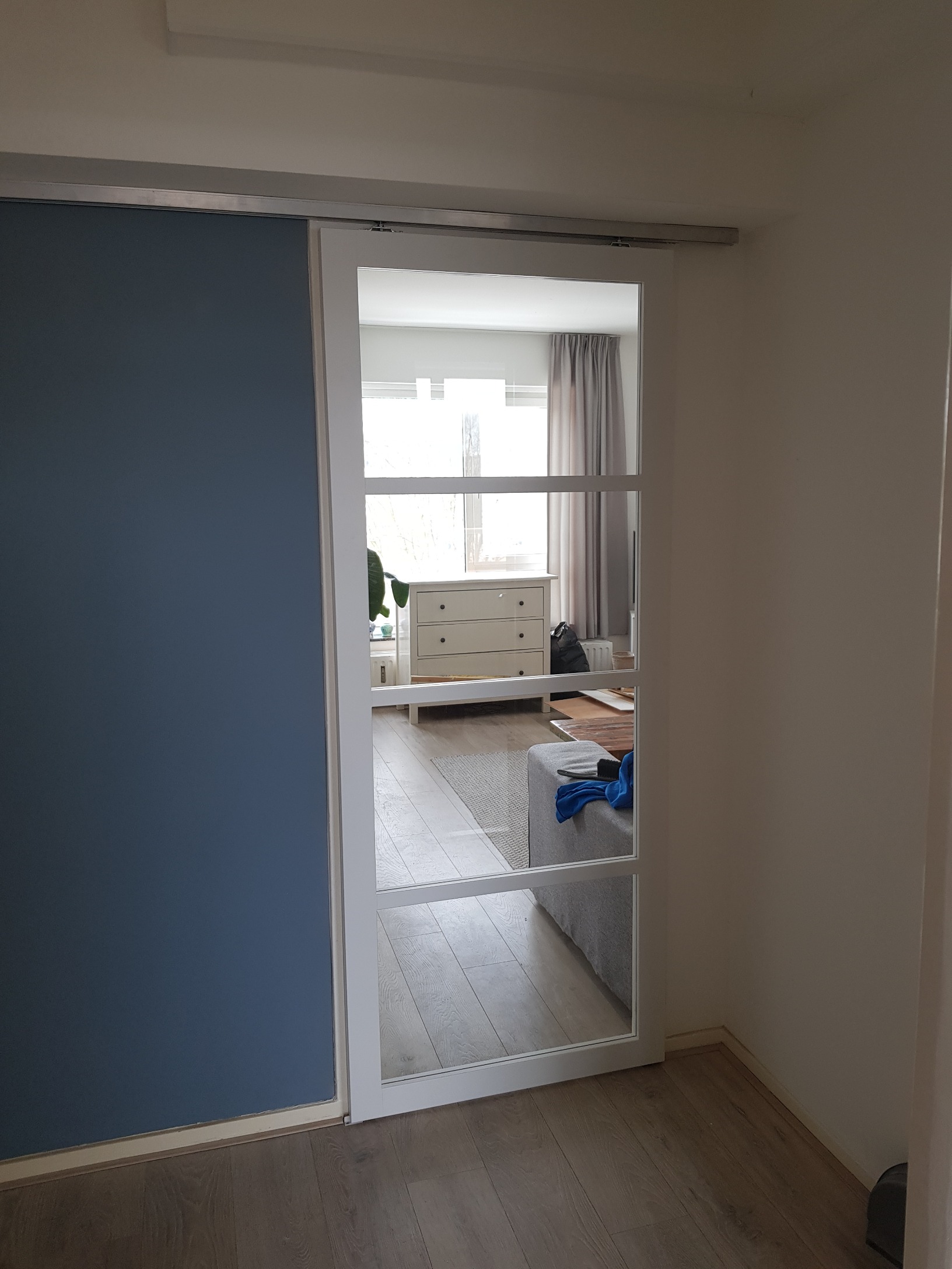 • Houten deur met vier glaselementen afgelakt in RAL-9001. Deur op maat gemaakt en voorzien van een rails met alu afdekkap.