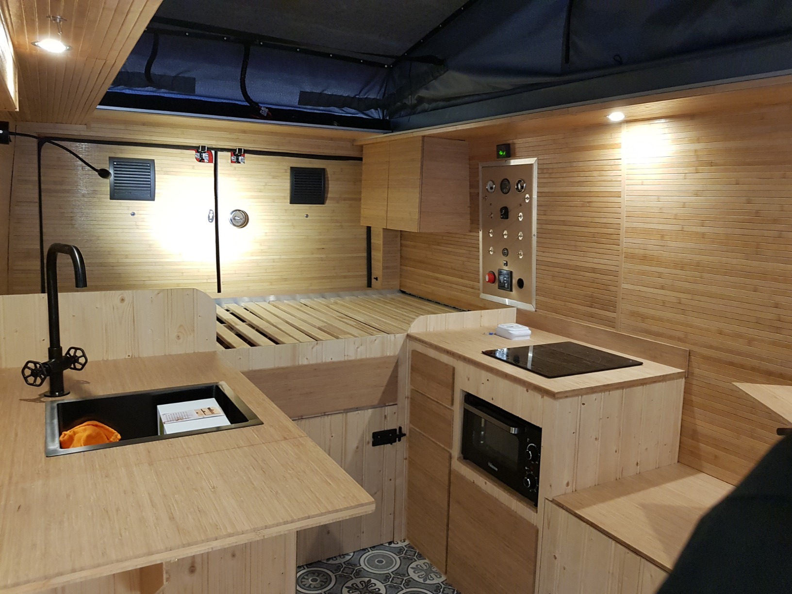 • Op maat gemaakte overkapping met overstek en verlichting. Douglas hout vooroverkapping, Bankirai delen voor de vloer.