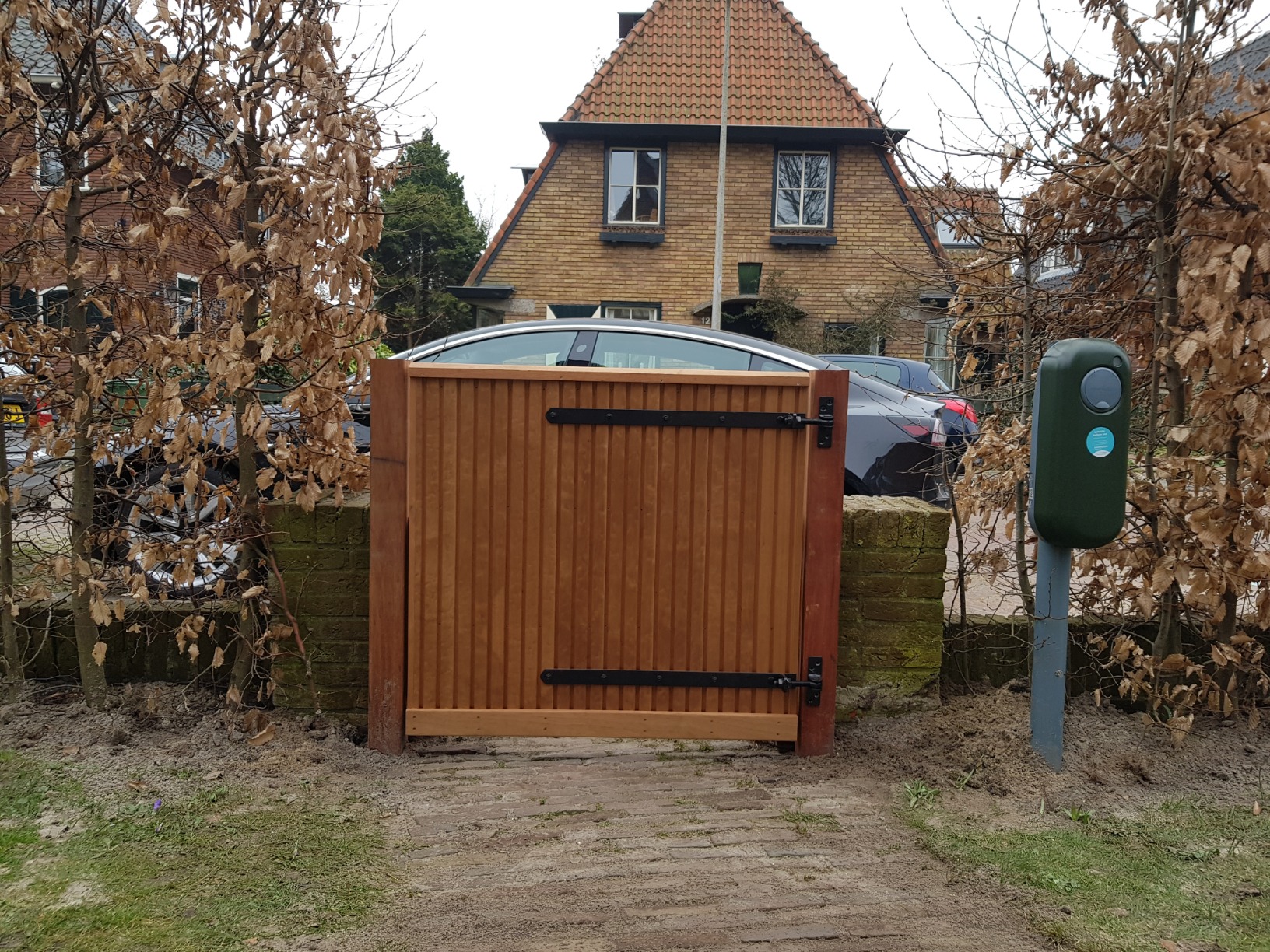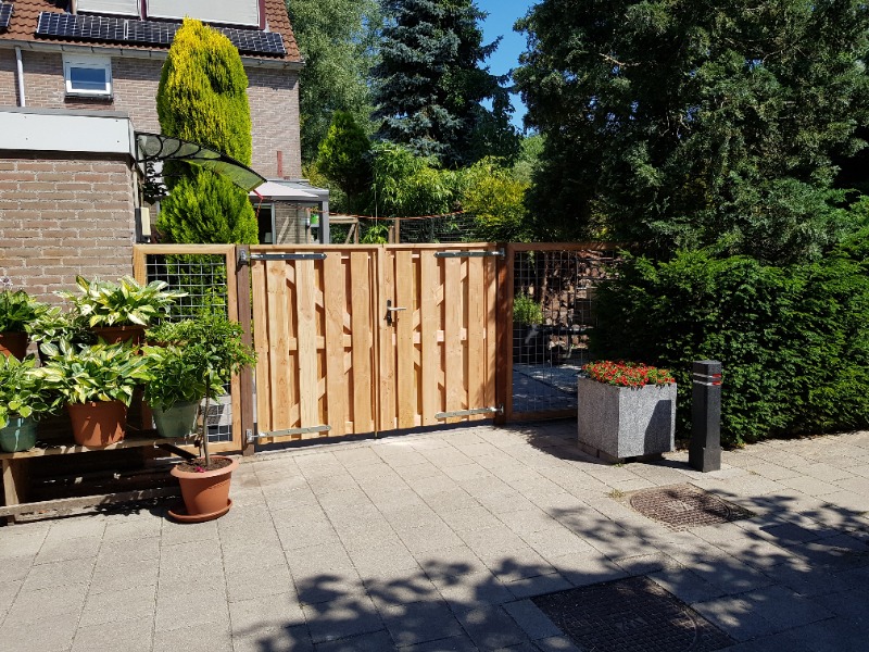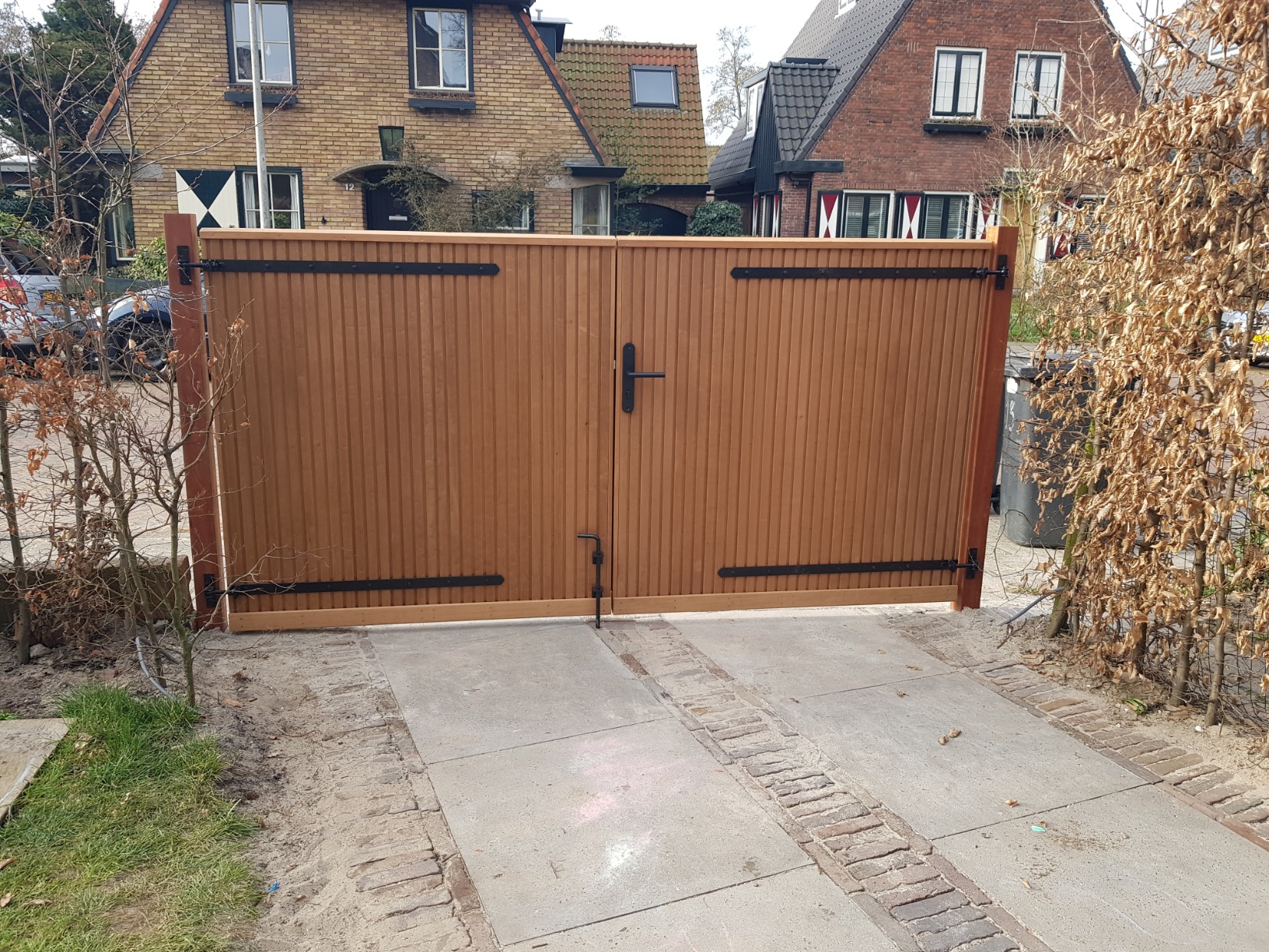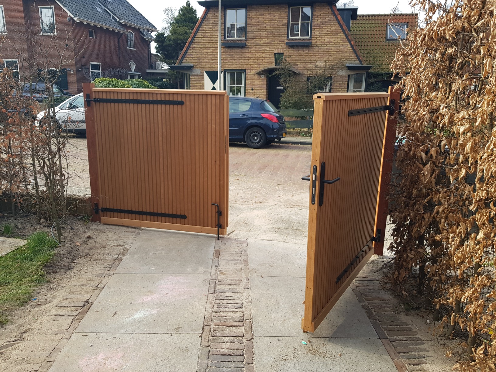 • Poortdeur gemaakt van ijzerframe met aan weerzijde 1,6 cm dikke Douglas schutting planken, incl. verstelbare scharnieren.
