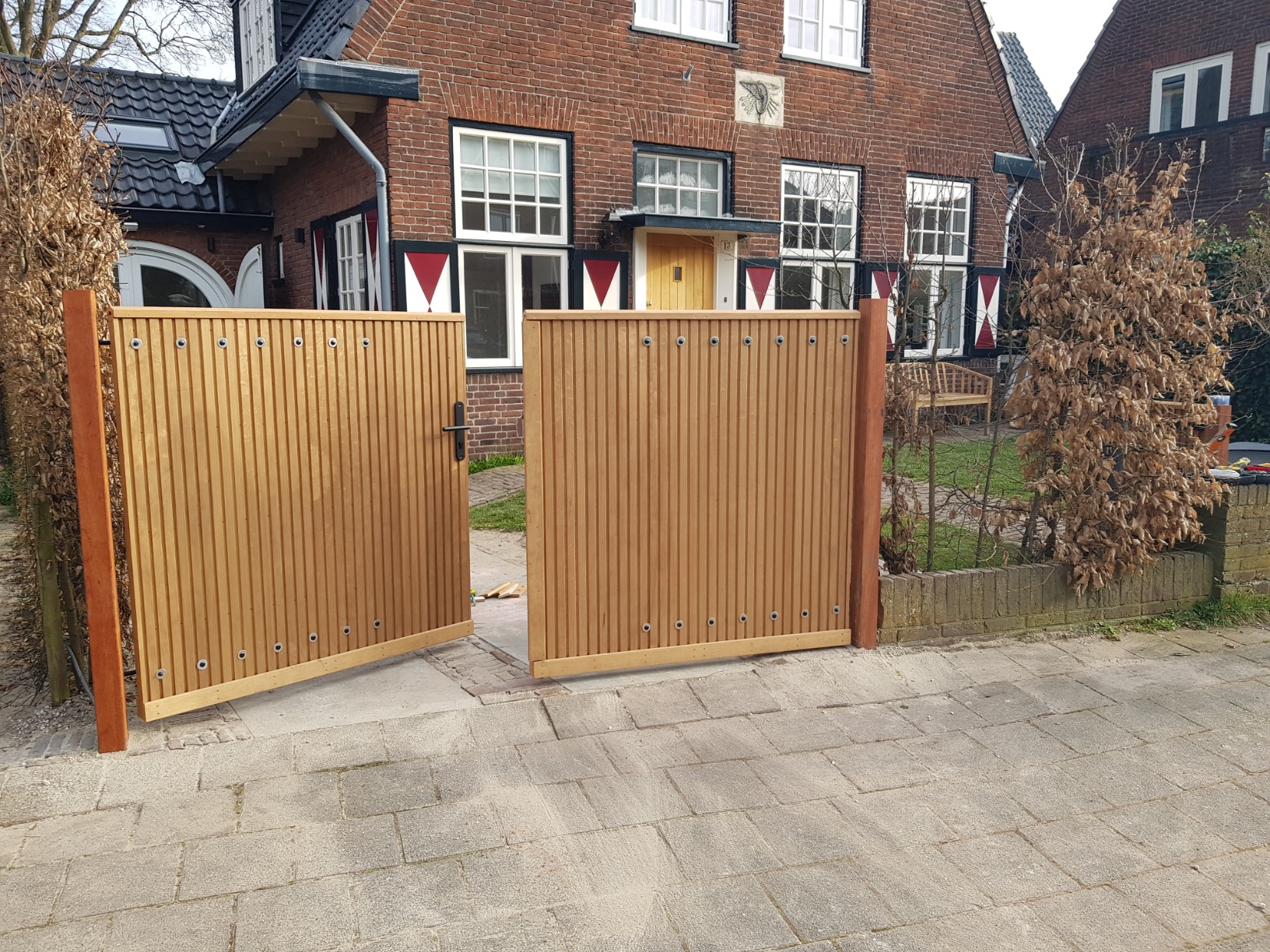 • Poortdeuren samengesteld van Ayous Thermo Triple hardhout en hardhouten steunpalen.