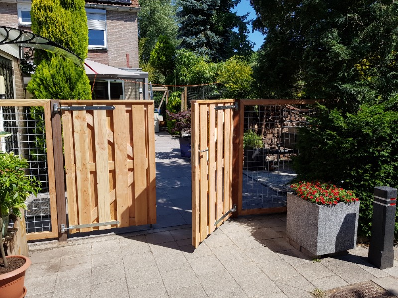 • Poortdeuren van Douglas planken (dikte 1,6 cm & 2,8 cm). Standaard ijzeren gaaswerk met Douglas houtframe.
