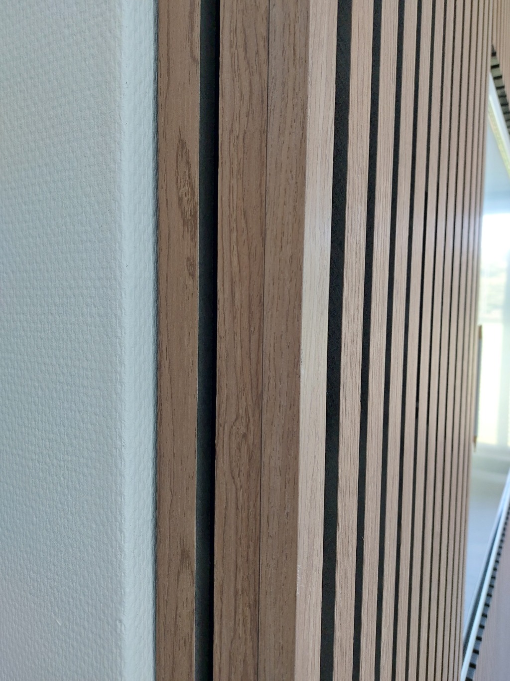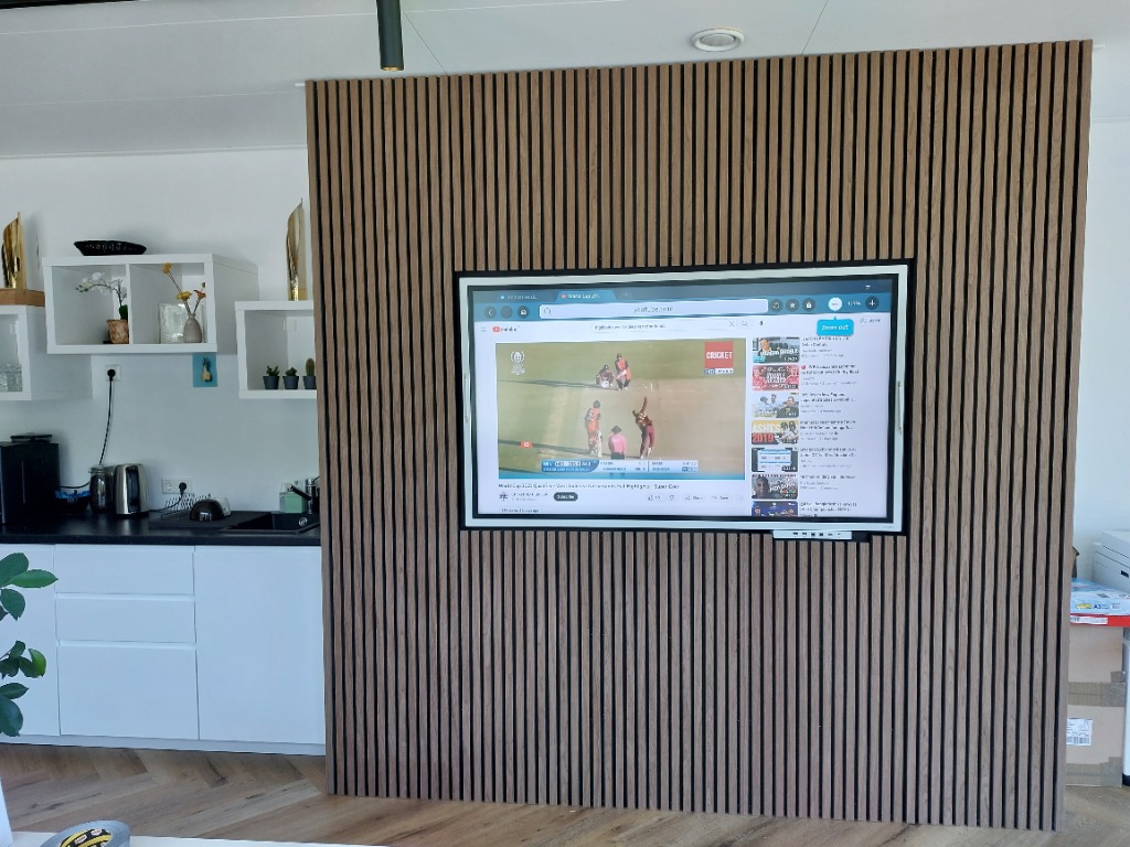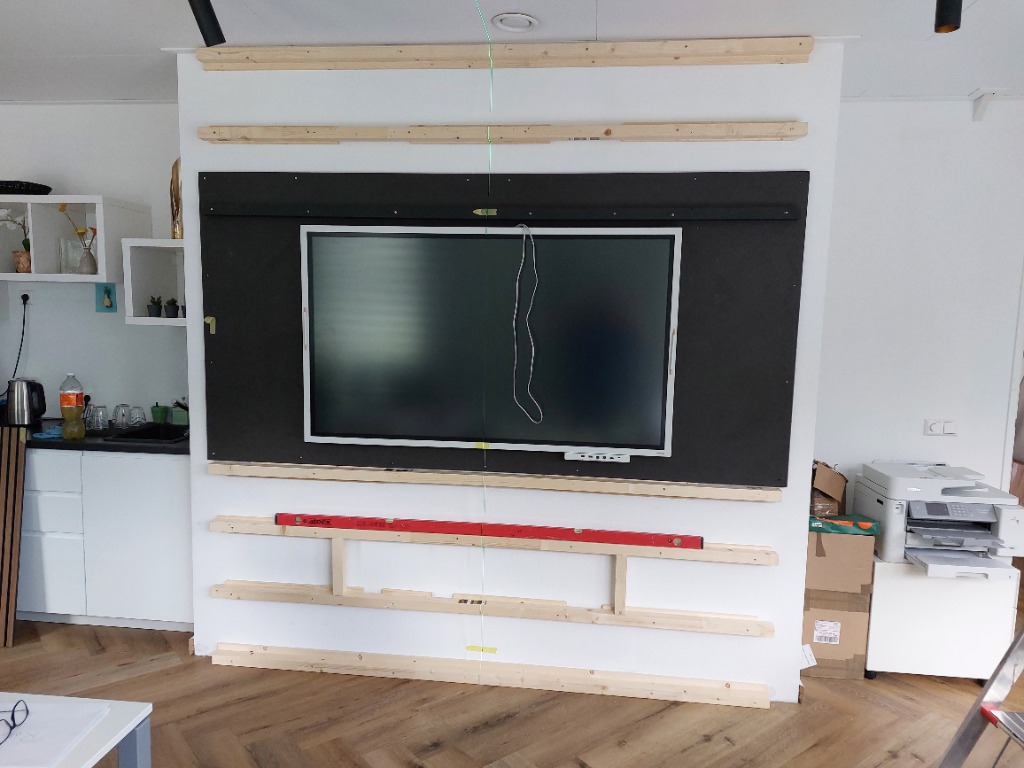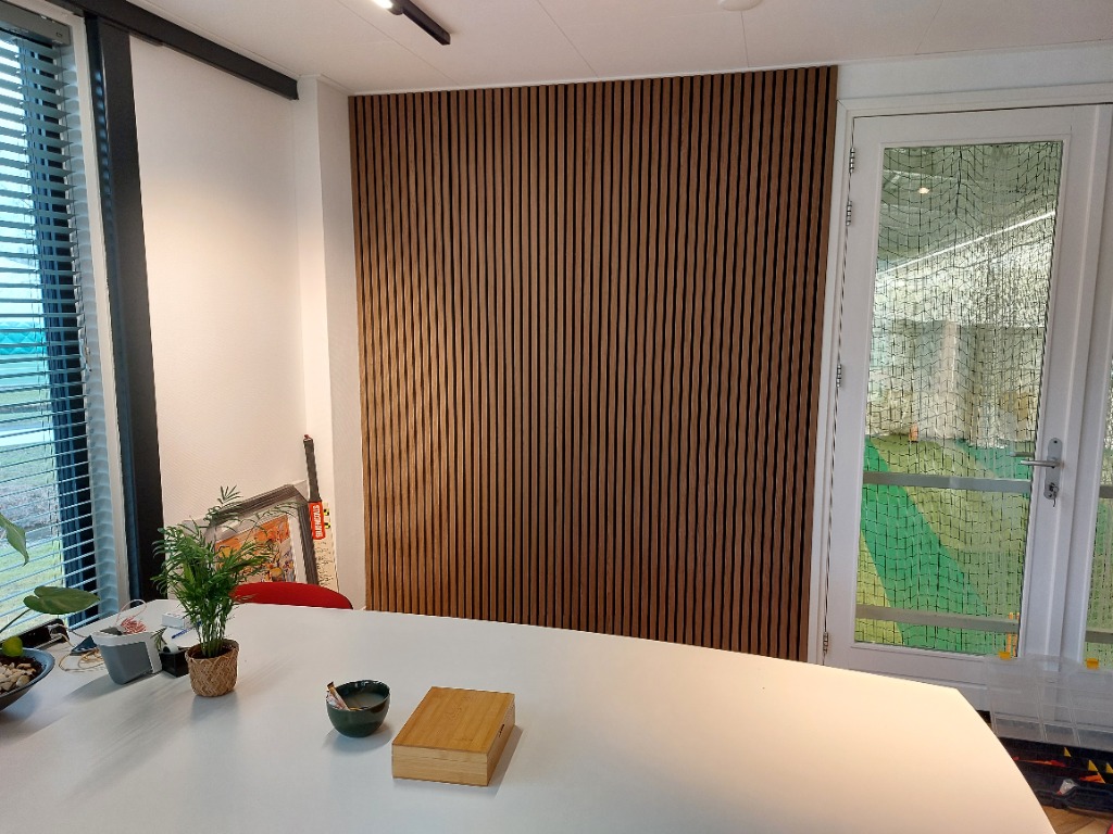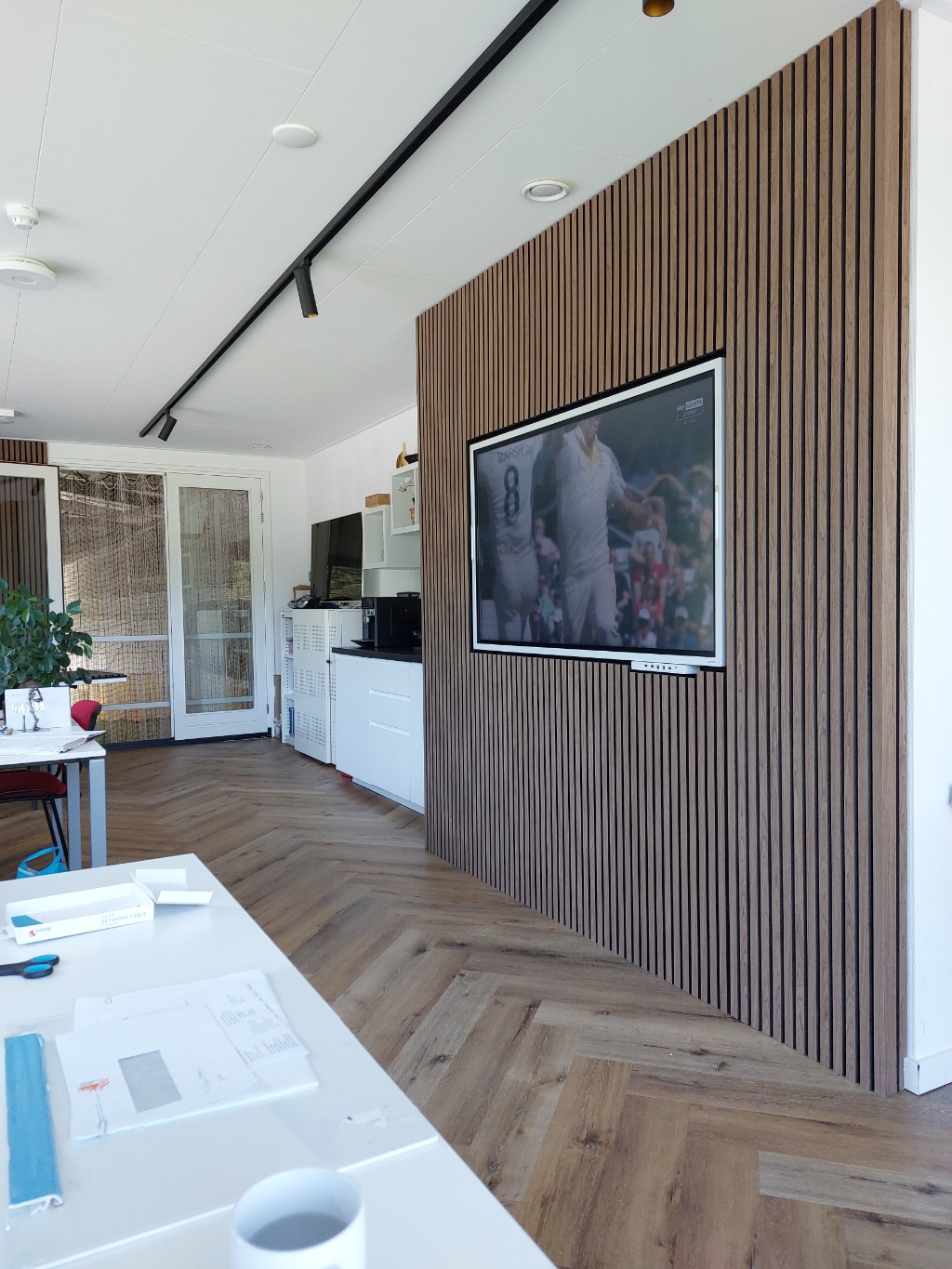 • Kantoorruimte twee wanden voorzien van akoestische panelen, waarbij in één wand een TV-scherm is ingebouwd.