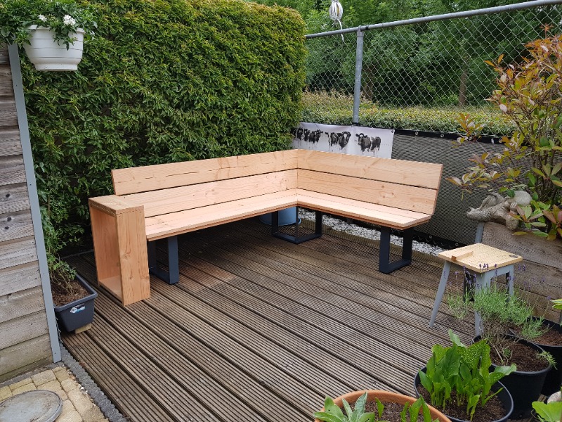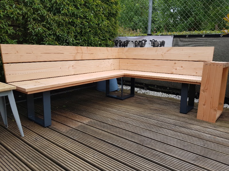 • Gemaakt van ijzen kokerprofiel onderstel met daarop Douglas 2,8 cm dikke planken.
